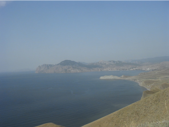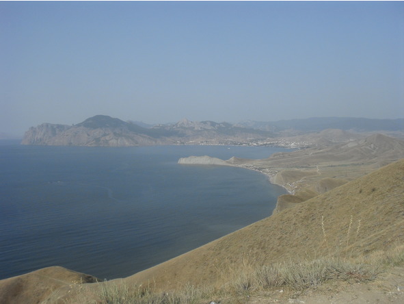 На первом плане мыс Хамелеон, напротив Карадаг, а тает в дымке загадочный Меганом.