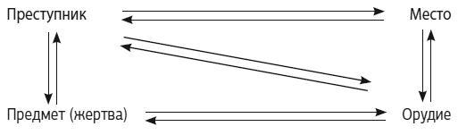 В криминалистике есть такое понятие как «крест следов» – оно отражает всю сущность криминалистической логики. Представьте квадрат, в каждом из углов этого квадрата по одному элементу: преступник, жертва (предмет преступного посягательства), место и орудие.