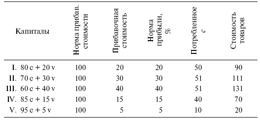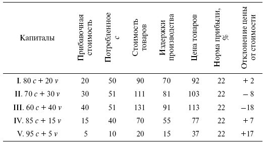 И только продажа их за такие цены делает возможным то явление, что норма прибыли во всех подразделениях I–V одинакова и равна 22 %, несмотря на различный органический состав капиталов I–V»[31].