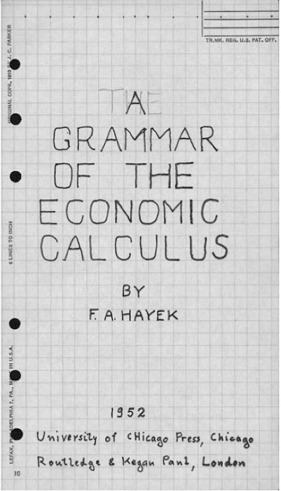 Принято считать, что в 1950—1960-х годах Хайек отошел от занятий экономической теорией и обратился к политической философии. Однако это распространенное мнение, как и многие расхожие мнения, неверно. На рис. I.1 воспроизводится сделанная от руки обложка работы «Грамматика экономического исчисления»; дата свидетельствует, что еще в 1952 г. Хайек задумал писать книгу по экономической теории. Существуют также заметки о «темах и проблемах», которые он намеревался затронуть; в их числе экономическая теория и инженерия, измерение, выбор, эквивалентность, альтернативные затраты, а также «сопутствующие ошибки», в числе которых понятия объективной ценности, оптимума, энергетики и справедливой цены[46]. В свою «Памятную записку о рабочих планах» 1955 г. Хайек включил эту книгу как возможный проект: «Я надеюсь не забросить совершенно мою работу по техническим аспектам экономической теории. Я давно думал, что следующей книгой в этой области будут “Основы экономического исчисления” – нечто вроде подробного введения в базовую логику экономической теории, предназначенного прежде всего для ученых и людей с научным складом ума. Но, хотя я собрал немало материалов на эту тему, их пока еще очень трудно превратить в книгу»[47].