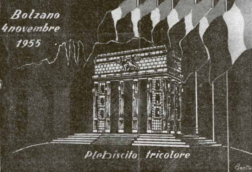 Um die italianità Südtirols zu unterstreichen, veranstalteten nationalistische Kreise am 4. November 1955 in Bozen einen plebiscito tricolore. Associazioni patriottiche verteilten diese Karte mit der Aufforderung „Ad ogni finestra una bandiera“. Die Veranstaltung nahm den Charakter eines widerlichen faschistischen Spektakels an.