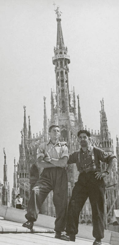 Sepp Kerschbaumer und Willy Alessandri vor dem Mailänder Dom bei der Motorradfahrt Frangart–Genua–Mailand–Frangart, um 1950