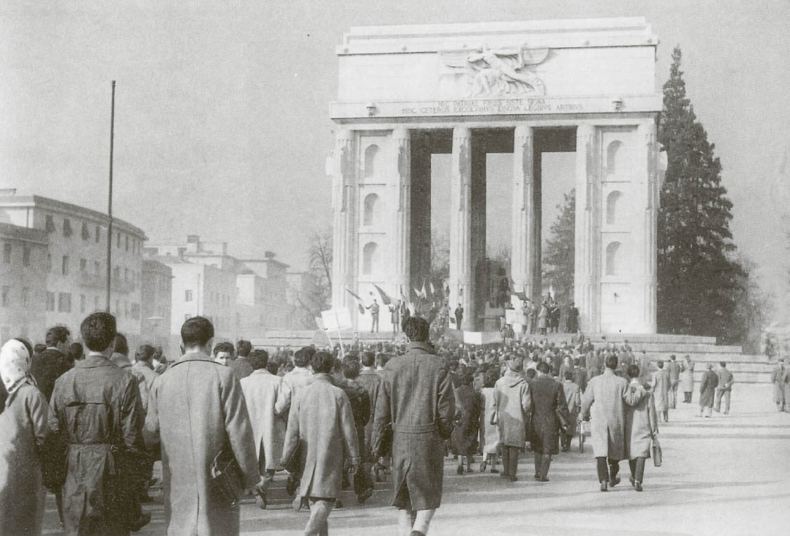 19. November 1957: Gegendemonstration vor dem Bozner Siegesdenkmal wider die Kundgebung von Sigmundskron