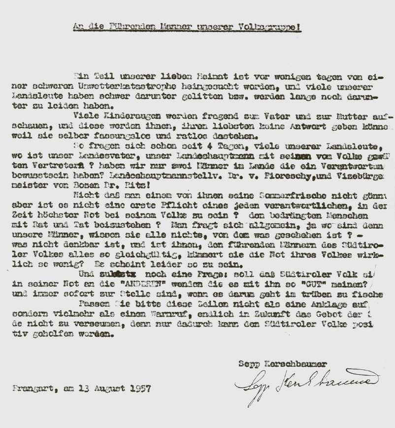 Jedoch die Vorgänge auf Sigmundskron und die Nachklänge zu Sigmundskron versetzten nicht nur die Italiener in Erregung. Sie lösten auch innerhalb der SVP ein Nachbeben aus. Josef Raffeiner gab im Senat am 26. November 1957 eine Erklärung ab, die mit der Linie der Partei nicht mehr im Einklang stand:59