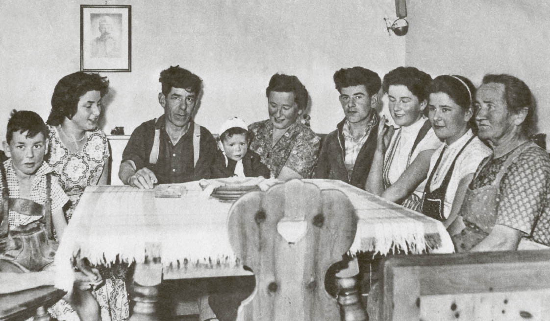 Sepp Kerschbaumer im Kreise seiner Familie. Von links Franzl, Luisa, Sepp Kerschbaumer, Christl, Maria Kerschbaumer, Seppl, Mali, Helga, Basl Moidl (Maria Mederle)
