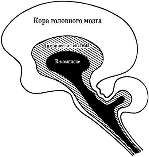 Следуя модели Маклина, можно сравнить три части (или слоя) нашего мозга с тремя братьями, живущими под одной крышей. Старший «брат» – так называемый R-комплекс, или «мозг рептилии», задача которого – поддерживать нашу жизнь. Этот брат отвечает за автоматическое и ритуальное поведение, которое становится доминирующим при сильном сопротивлении. Он не использует языка, хотя в определенной степени понимает его.