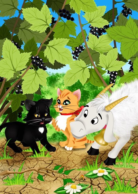 Once upon a time at the bank of a wide river in a small village two kittens lived. His name was Meowka and her name was Pusya. She had bright-red fur; he was charcoal-black with a white heart on his chest. They lived in a big cottage with granny Valery and old Graham.