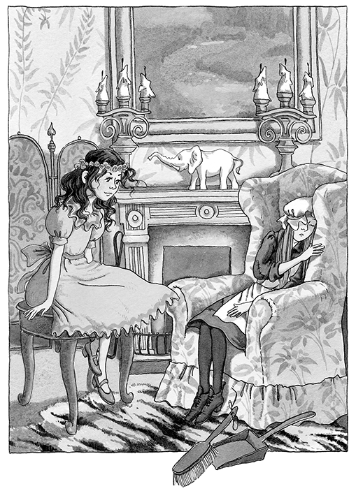 В тот же вечер Сара сидела в уголке классной комнаты и рассказывала собравшимся вокруг неё воспитанницам сказку. Вдруг в комнату робко вошла та самая девочка – она несла ящик с углём, который был явно слишком тяжёл для неё. Опустившись на колени перед камином, она стала подкладывать уголь в огонь и выгребать золу.
