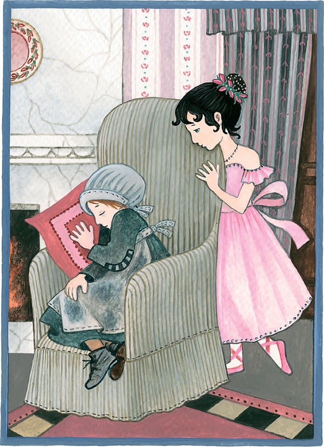 Она нисколько не рассердилась, что на её хорошеньком любимом кресле сидит девочка в грязном, перепачканном в угле платье. Она даже обрадовалась, увидав Бекки. Теперь, когда несчастная героиня её сказки проснётся, с ней можно будет поговорить. Сара тихонько подошла к ней и остановилась, глядя на неё. Бекки слегка всхрапнула.
