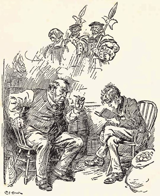 Вечером пришёл Дик, и они принялись за чтение. Это была удивительная, увлекательная книга. Действие происходило в царствование знаменитой английской королевы, которую некоторые называют Марией Кровавой. Когда мистер Гоббс услышал о её деяниях и привычке отрубать людям головы, подвергать их пыткам и жечь на кострах, он очень разволновался, вынул изо рта трубку, уставился на Дика и, наконец, вытер красным платком капли пота, выступившие у него на лбу. [11]