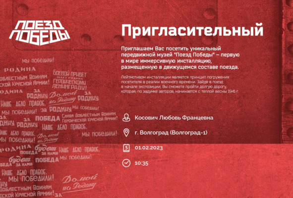 Искреннейшая благодарность сотрудникам некоммерческой организации социального обслуживания населения «Опора»: Галине Александровне Булгаковой, Эльвире Петровне Шитовой, Марине Владимировне Пчелиной, Дмитрию Михайловичу Сотникову, Геннадию Геннадьевичу Иванову, – за возможность посетить иммерсивный музей с историко-художественной экспозицией «Поезд Победы», организованный художниками творческой мастерской «Невский баталист», медиогруппой «Красный квадрат», движением «Волонтёры Победы», народным фронтом «Молодёжка ОНФ», и по материалам Интернета, впечатлениям написать рифмованный текст.