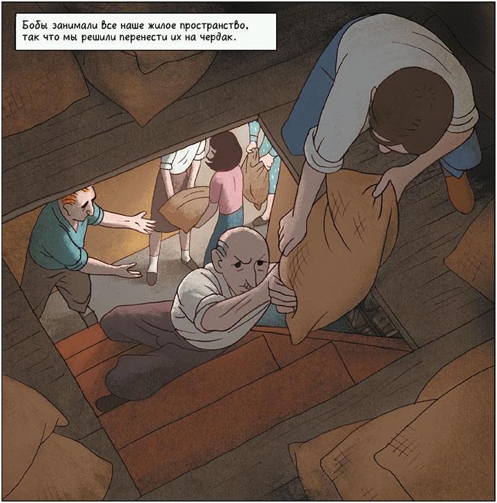 Но один из мешков порвался, и ливень, нет, град бобов обрушился по лестнице вниз! Грохот был, как на Страшном суде. Внизу, наверно, подумали, что старый дом со всем его содержимым валится им на голову.