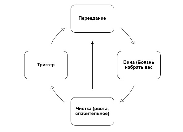 Первичные триггеры провоцируют человека на единичный эпизод переедания: переедание —> вина —> чистка. После переедания и последующей чистки человек останавливается и цикл прекращается.