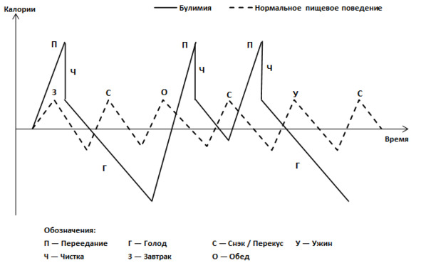 Как показано на графике ), люди с нормальным пищевым поведением едят достаточно часто, регулярно. Они не испытывают сильный голод и, следовательно, употребляют меньшее количество калорий за прием пищи. Люди с булимией съедают как минимум в два раза больше калорий, затем вызывают рвоту. Как видно на графике, чистка помогает частично избавиться от калорий. Однако часть калорий организм успевает усвоить. Например, сахар начинает расщепляться уже во рту и быстро усваивается организмом. Получается, что количество не выведенных с помощью чистки калорий равно уровню нормального потребления человека без РПП. Это объясняет факт, что большинство людей с булимией имеют ИМТ (индекс массы тела) в зоне нормы или чуть ниже нормы. После переедания и чистки человеку удается какое-то время игнорировать голод. Он пропускает прием пищи. Через какое-то время чувство голода достигает максимального значения, и, не в силах терпеть голод, человек, страдающий булимией, набрасывается на еду, переедает. После обжорства он опять испытывает чувство вины, вызывает рвоту, через какое-то время испытывает голод, затем опять следует переедание, рвота и т. д. (рис. 4