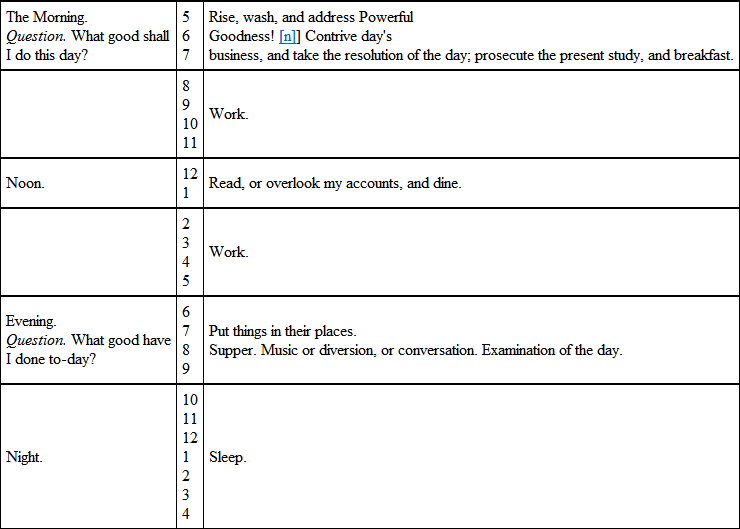 "Father of light and life, thou Good Supreme!O teach me what is good; teach me Thyself!Save me from folly, vanity, and vice,From every low pursuit; and fill my soulWith knowledge, conscious peace, and virtue pure;Sacred, substantial, never-fading bliss!"The precept of Order requiring that every part of my business should have its allotted time, one page in my little book contained the following scheme of employment for the twenty-four hours of a natural day.