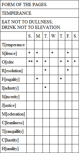 My list of virtues contained at first but twelve; but a Quaker friend having kindly informed me that I was generally thought proud; that my pride showed itself frequently in conversation; that I was not content with being in the right when discussing any point, but was overbearing and rather insolent, of which he convinced me by mentioning several instances, – I determined endeavoring to cure myself, if I could, of this vice or folly among the rest, and I added Humility to my list, giving an extensive meaning to the word.