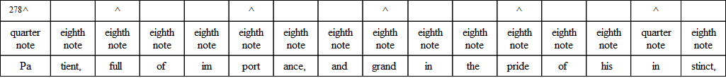 In reading this the first time, a person is not likely to notice that there are three feet in it containing but two syllables. The rhythm is perfectly smooth, and cannot be called irregular. The accent remains on the last syllable of the foot.
