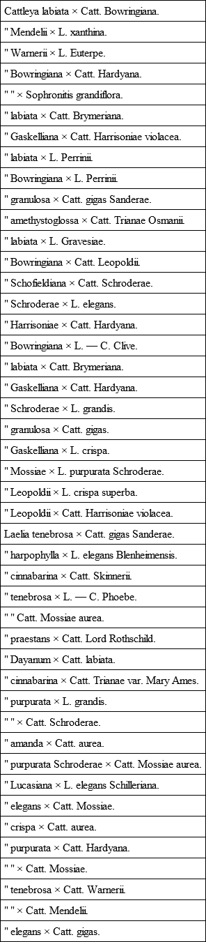 I append a list of hybrid seedlings which have not yet flowered and therefore have received no name as yet. It will be useful only to those who practise the fascinating art of Hybridisation. But such are a multitude already, and each year their numbers swell.