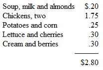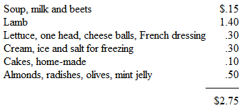 The next morning the sisters added up their accounts and set down the dinner menu and what it cost in a little dinner-party book which was often used for reference by them. This is what the dinner proved to have cost:
