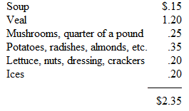 The soup was made of very ordinary materials, but it looked and tasted well. The roast was crisply browned and juicy within, and the delicious stuffing and broiled mushrooms were substantial and good. The salad was lettuce covered with chopped almonds put on after the French dressing. The ices called for no cream and so were inexpensive. The figures showed this result: