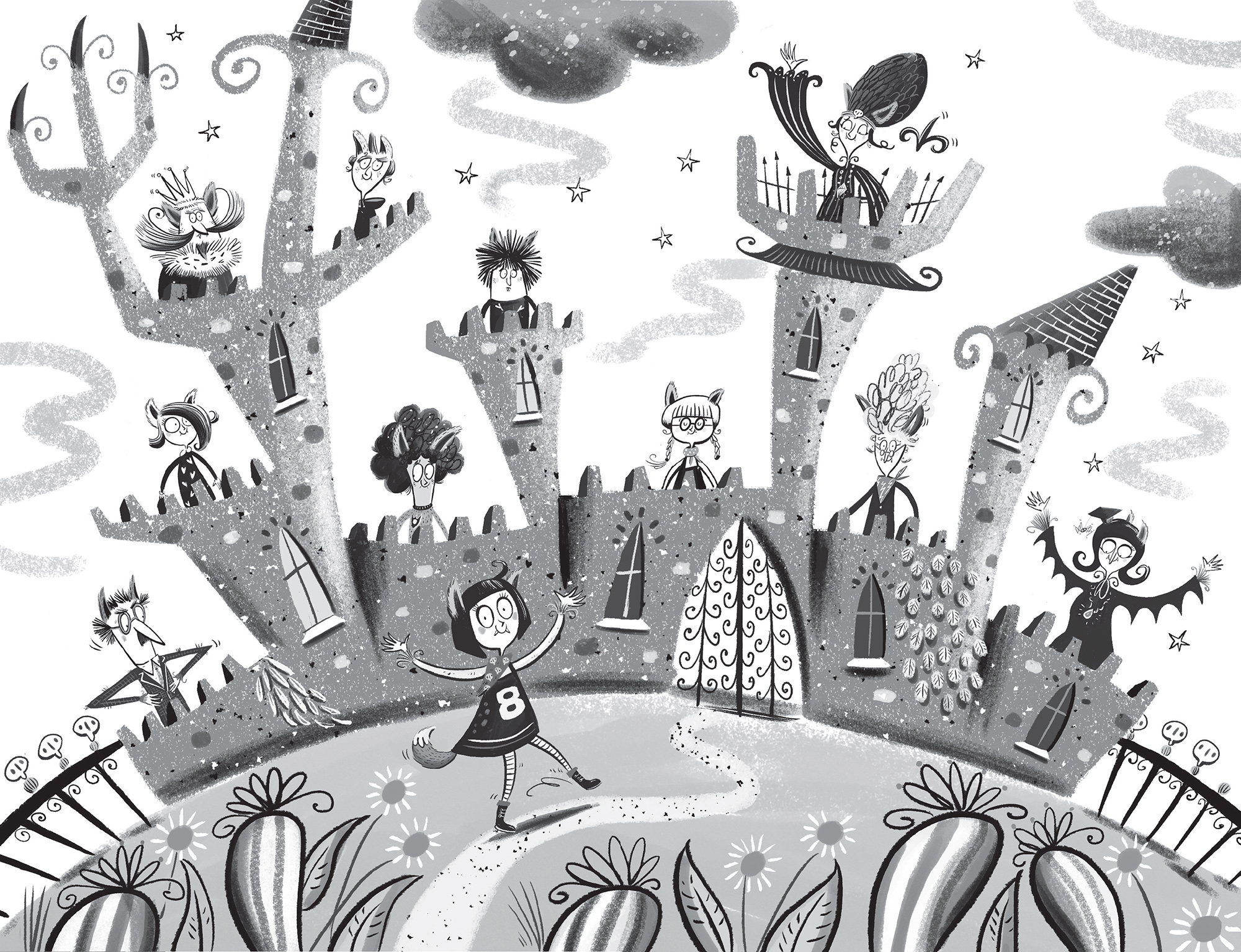 Lottie was werewolf royalty. Not only that but she had been born during a lunar eclipse, which had given her special powers: she could run like the wind, she was exceptionally strong, she could hear almost as well as Jaws … and she could see infinitely better than everyone else too. Round her neck was a moonstone necklace that celebrated her special birth; when she was happy, it glowed white, but if she was sad or worried it was dull … and, on the few occasions when Lottie was bored, it turned grey. Wilf and Marjory knew her secret, and they also knew her other secret – that she lived in Dracon Castle, her father was a king and her mother a queen.
