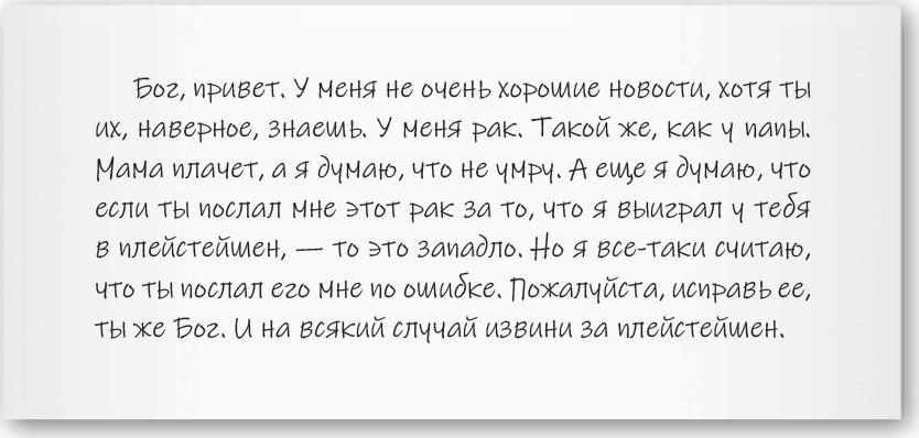 Чернилами, черными как кровь, я отвечаю Алексу. От имени Бога, в которого я не верю. Руками, которые не слушаются меня, я пишу слова, в которые я тоже не верю. Буквы, в свою очередь, не верят мне и расплываются на бумаге, будто хотят сбежать. Бумага рвется подальше от этого постыдного всего и просто рвется. «Алекс, привет. Хорошо, что ты мне написал. Сам не знаю, как это получилось, но я все исправлю. Так что – не болей. Маме привет. Пусть не плачет. И да – мы еще сразимся с тобой в плейстейшен. Твой Бог». И росчерк. Руки Фредди Меркьюри дрожат, и росчерк тоже получается некрасивый, смазанный, как будто Фредди пьян или плачет.
