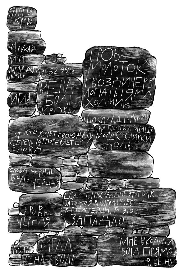 Молюсь: яйца молоко сливки черви лопата яма игла вена кровь табличка с именем мама шла Саша по шоссе холмик камень ограда шоколад черный слова черные боль черная мука черная молоко черное черви черные кровь черная.