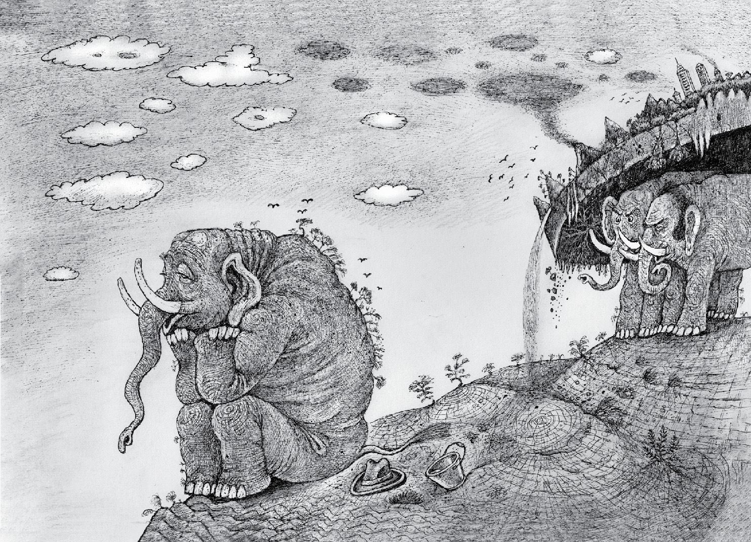 Я доплыл до черепахи, поздоровался с ней, и она подставила лапу, помогая мне забраться на ее панцирь. Вылез я рядом со слоном, который бросил небо. Он сидел и меланхолично болтал ногами в луже, не обращая на меня никакого внимания.