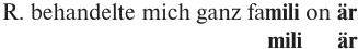 Правда, ограничение устраняется не целиком, не без замены, из которой его можно восстановить. Также наличествовало и другое видоизменение. Слово «фамильярно» в нешутливой речи превратилось в тексте остроты в «фамилионерно». Вне сомнения, именно с таким словообразованием связаны характер остроумия и сама смехотворность шутки. Новое слово отчасти совпадает по звучанию со словом «фамильярно» из первого предложения, а в своих конечных слогах – со словом «миллионер» из второго предложения. Замещая одну составную часть слова «миллионер», оно как будто замещает полностью второе, пропущенное предложение и так заставляет нас предполагать его присутствие в шутке. Можно говорить о составном образовании из двух слов – familiär и Millionär. Пожалуй, стоит начертить схему, чтобы наглядно показать рождение нового слова из обоих предыдущих[11].