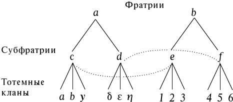 Двенадцать тотемных кланов распределены между двумя фратриями и четырьмя субфратриями. Все они экзогамны[18]. Субфратрии c и e формируют экзогамное единство, как и субфратрии d и ƒ. В результате в цели такого распределения не приходится сомневаться: так обеспечивается дальнейшее ограничение брачного выбора и половой свободы. Предположим, что в каждом клане равное число членов. Существуй всего двенадцать тотемных кланов, у каждого члена клана был бы выбор между 11/12 всех женщин племени. Наличие двух фратрий ограничивает выбор до 6/12, или половины; мужчина тотема а может жениться на женщине только из кланов от 1 до 6. При введении четырех субфратрий выбор сужается до 3/12, или до 1/4; мужчина тотема а вынужден ограничить свой брачный выбор женщинами тотемов 4, 5 и 6.