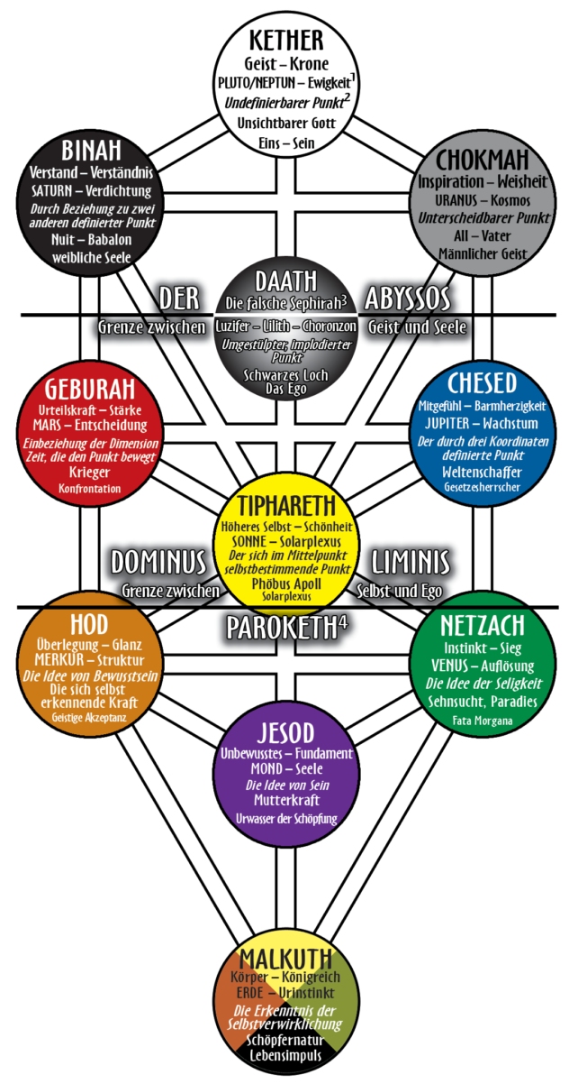 1 Neue Zuordnung: Statt Pluto zu Kether, Neptun zu Chokmah und Saturn zu Binah haben wir uns eine Umverteilung erlaubt = Kether zu Pluto/Neptun, Chokmah zu Uranus und Binah wie bisher zu Saturn.