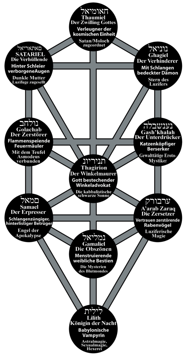 3 Daath oder Daäth ist die falsche Sephira im Abyssos, der Grenze zwischen persönlicher und geistiger Welt, Wohnsitz des Erzdämons Choronzon, der die Seele mit falschen Verlockungen in den Verstrickungen des Ego festhält.