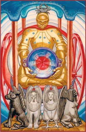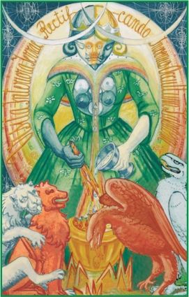 Der rote Löwe und der weiße Adler stehen für die bewussten männlichen und weiblichen Sexualkräfte, Symbole des männlichen und weiblichen Dualitätsprinzips wie Sonne und Mond, Feuer und Wasser oder Luft und Erde. Crowley bringt sie mit der Alchemie in Verbindung: Sie treten in der Chemie als Säure und Lauge in Erscheinung. In dieser Erscheinungsform repräsentiert die verhüllte Gestalt das Proteische Element des Kohlestoffs, dem Ursprung allen organischen Lebens.4 Im Verlauf der alchemistischen Operation werden sie sich in Farbe und Bewegungsausdruck aber noch entscheidend verändern, und in der Karte Kunst sind sie auch nicht mehr so statisch, sondern in Haltung und Gebärde ziemlich aktiv: Der rote Löwe ist dann weiß geworden und der weiße Adler rot. Darin liegt auch V.I. T.R.I.O.L. verborgen – die Formel zur Öffnung des Orphischen Eis.5 Ein versteckter Hinweis findet sich auch im letzten Detail. Das Gewölbe des sakralen Raumes, in dem die Hochzeit stattfindet, wird von Schwertern dargestellt. Der Meister verweist auf den hebräischen Buchstaben & Zajin, der Schwert bedeutet, und mit jedem Akt der Teilung – aus Eins mach Zwei – in Beziehung steht, denn Liebende sind im Tarot wie im tatsächlichen Leben immer zu zweit: Zwei, die sich entschieden haben, ihre persönliche Identität einer verbindenden Zweisamkeit zu opfern, nachdem sie von Cupidos Pfeil 5 getroffen wurden.