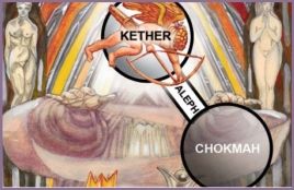 5 Über der ganzen Szene richtet Cupido oder Eros am oberen Bildrand mit verbundenen Augen seinen Pfeil ins Leere. Trotzdem hat dieser Akt eine tiefere Bedeutung. Der abwärtsgerichtete Pfeil8 wird vom höchsten Punkt des Jod im JHVH geschossen und der Winkel der Schussrichtung entspricht Pfad 11 = Aleph. Das Geschoss aus Amors Köcher (wir sehen ganz fein darin das Wort Thelema eingeritzt, Sinnbild des höheren Willens) verwandelt sich in ein Zeichen der Liebe unter Willen, denn er fliegt direkt von Kether nach Chokmah und aktiviert damit die göttliche Liebe oder das menschliche Bild der Liebe Gottes (Jod in Chokmah). Das zeigt, dass die Kraft, die die Menschen sexuell stimuliert, mit der Sehnsucht nach dem Paradies identisch ist.