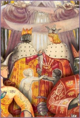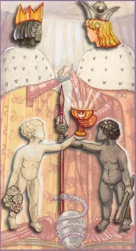 4 Das ganze Ensemble ist kontrapunktisch miteinander verknüpft und trotzdem sind alle Figuren auch selbstständig: Der weiße Junge vor dem schwarzen König hält mit der weißen Königin zusammen den goldenen Kelch (Öffnung und Hingabe), und der schwarze Knabe vor der weißen Königin hält zusammen mit dem König den silbernen Speer (Durchsetzung und Zeugungskraft). Dies ist vielleicht deshalb so, weil es ein wesentliches Merkmal der heiligen Hochzeit ist, dass der Mann sich nicht einfach nur mit seiner Anima verbindet oder umgekehrt, sondern sie gleichzeitig auch als ein Wesen sieht, das in höherem Maße von seinem bewussten Ich verschieden ist, als er je zuvor erkannt hat.