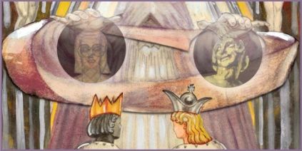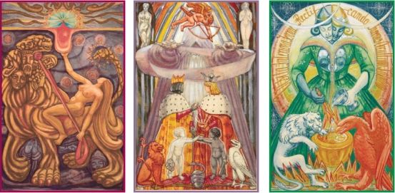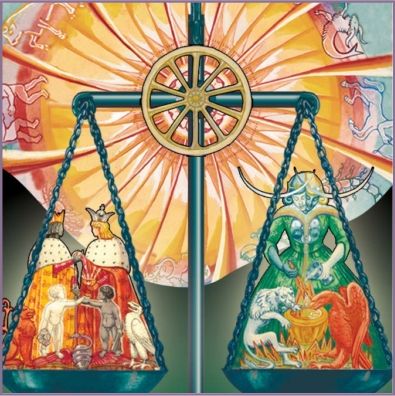 Er will uns damit sagen, dass wir den Blick nicht auf die Probleme aus der moralischen Schuld und Sühne-Ecke werfen sollten, sondern unser Auge auf die Verbindung der Dinge richten sollten, auf die heilige Hochzeit, die die Vereinigung der zuvor geschiedenen Gegensätze symbolisiert (XIV – Kunst). Bewusstsein muss sich aus dem Naturzustand durch Differenzierung entwickeln und Gut funktioniert nicht ohne (scheinbar) Böses, Erlösung nicht ohne (scheinbare) Schuld. Jeder Mensch trägt sowohl gut wie böse, Abel und Kain in sich, und Sinn und Zweck ist weder die Kompensierung des einen durch die Übertreibung des anderen noch die Regression, die Flucht in den Mutterschoß vor den unvermeidlichen Verletzungen und Ungerechtigkeiten, die das Leben beinhaltet. Ziel muss sein, die beiden Teile, die in der menschlichen Entwicklung getrennt wurden, als wir uns durch das Bewusstsein von den Tieren zu unterscheiden lernten und ein (duales) Interesse für eine soziale Kultur zu entwickeln begannen, durch differenziertes Erleben und Aufarbeiten wieder miteinander zu versöhnen. Wenn das Paradies die ursprüngliche Einheit der unbewussten Natur als Ausgangspunkt verkörpert, dann richtet sich das Ziel unserer Reise auf das bewusste Erkennen der psychischen Mechanismen und schöpferischen Zusammenhänge. Salopp formuliert ist die Ganzheit unserer Seele das Ziel: die Liebe unter Willen, um sich aus dem Karmarad zu befreien.
