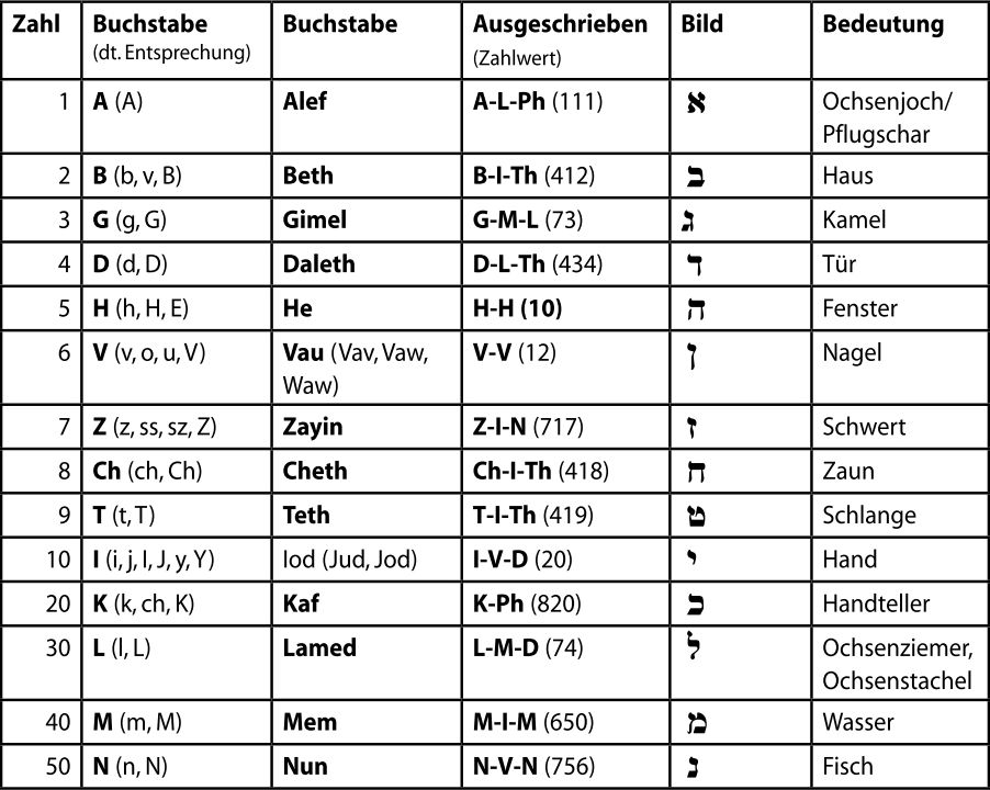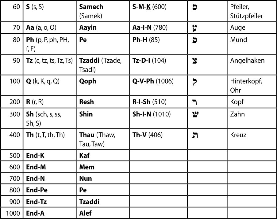 Dringen wir zum Abschluss noch etwas tiefer in die Geheimnisse des hebräischen Alphabets ein. Crowley schreibt, dass die beste Theorie, die dem Tarot in seiner symbolischen Veranschaulichung des Universums zugrunde liegt, auf den Daten der Kabbala basiert: Der hier maßgebliche Teil wird Gematria genannt, reine Wissenschaft, in der der zahlenmäßige Wert eines hebräischen Wortes, wobei jeder Buchstabe auch eine Zahl darstellt, dieses Wort mit anderen gleichen Wertes oder einem vielfachen davon verbindet.1 Die Aufgabe liegt darin, den hinter Zahlen und Buchstaben verborgenen Sinn oder die tiefere Bedeutung des Wortes zu suchen. Das macht es möglich, statt eines Wortes einen Zahlwert anzugeben, der das Wort symbolisiert und umgekehrt.2 Die Kabbalisten sind der Meinung, dass jede Zahl mehr als eine abstrakte Formel ist, nämlich eine unabhängige, individuelle Idee, Teil eines unerklärlichen Mysteriums, das hinter den mathematischen Beziehungen zwischen Zahlen und Buchstaben Gott oder Jehova darstellt. Der Preis dieses Erkenntnispfades ist aus Sicht des Mathematikers allerdings die Abwesenheit einer letztlich exakten Definition, denn die Zahlwerte können natürlich unterschiedliche Worte beinhalten. In der Tabelle sind die hebräischen Buchstaben mit ihren zugehörigen Zahlwerten aufgeführt: