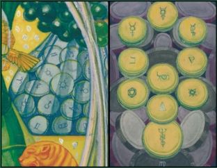 5 Wir sehen, dass das Bündel mit den Münzen, die der Narr bei sich trägt, mit den Goldstücken der Scheiben-Zehn korrespondiert. Das zeigt, dass der geistige Schöpfer der Karten nicht nur die Verbindung zwischen Narr und Universum, dem Schnittpunkt der Spirale der Großen Arkana, sondern auch zwischen Narr und Zehn der Scheiben, der letzten Karte der kleinen Trümpfe, im Auge hatte.