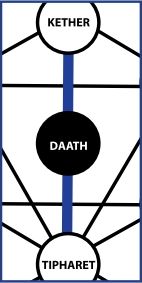 Oder wir stellen das Kreuz auf den Kopf (Jesod), dann berührt es die Scheide des Göttlichen am umgestülpten, implodierten Punkt Daath. Motto: Die empfangende Materie zieht den männlichen Geist an sich heran. Dann wäre der Phallus die Spitze des Wissens, die an der Schwelle des Unfassbaren anklopft.