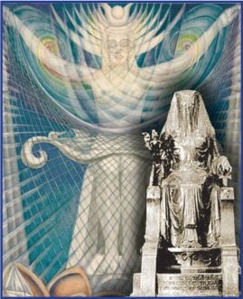 Bild: Eine gekrönte Priesterin sitzt vor dem Schleier der Isis zwischen den Pfeilern von Seth