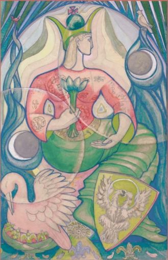 Schlüsseln wir die Symbole der Reihe nach auf: Das achtspitzige Malteser- oder Johanniterkreuz auf ihrem Haupt2 steht für die irdische Regentschaft und die Bedeutung der Vereinigung zwischen spiritueller und sexueller Natur. Auf Kopf- oder Bewusstseinshöhe sitzen zwei der heiligen Vögel, der Sperling als ein der Aphrodite zugeordnetes Symbol der Lust und die Taube als christliches Relikt unbefleckter Empfängnis.3 Der Lotus oder Stab der Isis in der Rechten auf Herzhöhe zeigt, dass sie alle fruchtbaren Energien im Zentrum ihres Herzchakras zur Entfaltung bringt, und deutet gleichzeitig die Regentschaft über den Phallus des Kaisers an.1 Die geöffnete linke Hand und der Blick nach links auf die heilige Taube (aus Sicht des Betrachters rechts) unterstreichen Empfänglichkeit und Mutterschaft. Ihr rot-grünes Kleid bringt ihre immensen Kräfte gut zum Vorschein, weil die Natur in diesen Farben vorteilhaft zur Geltung kommt. Die emsigen Bienen auf dem Kleid sowie die Fische und Lilienblüten auf dem (Asphodelien-)Grund, Symbol für Unschuld und Jungfräulichkeit, auch wenn ihr üppiger Stempel an den Phallus eines Esels erinnert, sind ein weiteres Indiz für ihre sammelnde und bewahrende Art. Um den Bauch (Solarplexus) trägt sie den Gürtel des Zodiaks. Mit einem Satz: In ihr drückt sich das emotionale Verlangen nach Ganzheit aus, weil nur die weibliche Kreativität in Verbindung mit Gefühlen für eine Erfahrung von Vollständigkeit sorgt.