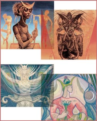 Gottheiten: Die Himmelskönigin als All-Geberin, Matriarchin, Creatrix, Initiatrix mit ihren vielen Namen; die Göttinnen des abnehmenden Mondes: Ceridwen, Cybele, Daeira, Eleusis, Hebe, Isis, Kore, Kurukulla, Levvanah, Luna, Melaina, Maya, Phoebe, Selene; im Doppelpack als Isis/Nephtys, Eva/Lilith, Inanna/Ereschkigal oder Demeter/Persephone
