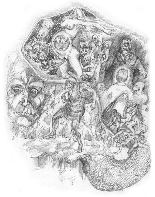 Tief in meine Betrachtungen versunken hatte ich die erste Etappe meines Ziels hinter mich gebracht. Ich stoppte einen kurzen Moment, um mir einen weiteren Blick nach oben zu gönnen, doch war das Ende des Turmes zwischen den tief hängenden Wolken noch immer nicht zu sehen. So machte ich mich an die zweite Hürde. Doch während die erste Umrundung noch relativ leicht vonstatten gegangen war, verspürte ich nun einen deutlichen Kräfteverlust. Das Gewicht auf meinen Schultern schien sich verdoppelt zu haben, und ich begann schon nach wenigen Schritten jämmerlich zu keuchen. Der Schweiß brach mir aus allen Poren, rann mir die Glieder hinab und wurde von meinem Büßergewand aufgesogen, das schon bald wie eine zweite Haut an mir klebte. Gequält richtete ich den Blick auf den vor mir ausschreitenden Sünder, der sein Tempo ebenfalls verlangsamt hatte. Angestrengt sann ich darüber nach, wie viele unzählige Liter Schweiß während diesem mühsamen Streben sich bereits auf diesem staubigen Pfad verteilt haben mussten. Hätte ich solch eine Überlegung sonst gerne noch jemandem mitgeteilt, schien sie mir unter den gegebenen Umständen nicht mal einer Erwähnung wert. Zu kostbar dünkte mich jeder Atemstoß, den ich nicht mit unnützen Worten zu verschwenden gedachte. Das vierte und letzte magische Grundprinzip, das Schweigen, kam mir in den Sinn, das mir nirgendwo angebrachter erschien als hier. Diesmal sah ich vor meinem inneren Auge eine hochschwangere Frau, die als Urprinzip allen Seins die gesamte Welt aus sich hervorbrachte. Gefühlsregungen in all ihren schillernden Facetten ergriffen von mir Besitz und ließen mich abwechselnd auflachen oder vor Traurigkeit laut aufschluchzen. Die erwachenden sexuellen Kräfte schienen eine gewaltige Verunsicherung in mir zu verursachen, denn mir kam ein lange zurückliegendes Erlebnis aus meiner Pubertät wieder in den Sinn, über das ich bereits in der Krebs-Hölle meditierte, als ich beim Onanieren vom Vater überrascht worden war. Ich sah die hämischen Gesichter des Pfarrers, meines Onkels, und meines Vaters vor mir auftauchen und schickte ihnen die Botschaft, dass ich ihnen ihr Unvermögen, der Freude der Schöpfung um ihrer selbst willen damals nicht anders begegnen zu können, bereits verziehen hatte.