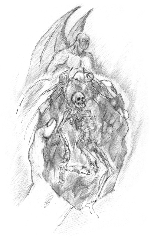 Wie die Codierung eines alttestamentarischen Informationsmusters stand der Wächterengel plötzlich vor mir da: der kinderkopfgroße Stein, darunter ein Skelett, ein Knochengeflecht, halb entblößt und halb in den düsteren Mantel der Verwesung eingehüllt, das mich aus tiefstem Nichts ansah. Nacktes Entsetzen durchschoss meinen Geist und lähmte meine Beine, doch bevor ich zusammenknickte, entzündete sich im Zentrum der Erscheinung eine goldene Flamme und verbrannte die Vision in einem Schlund aus flüssigem Licht. Akron packte mich an der Hand: „Das ist aber nicht alles. Schau – ich hab noch ein passendes Outfit für dich!“ Er zog grinsend einen weißen Stoff unter seinem Mantel hervor, den er vor mir aufschüttelte.