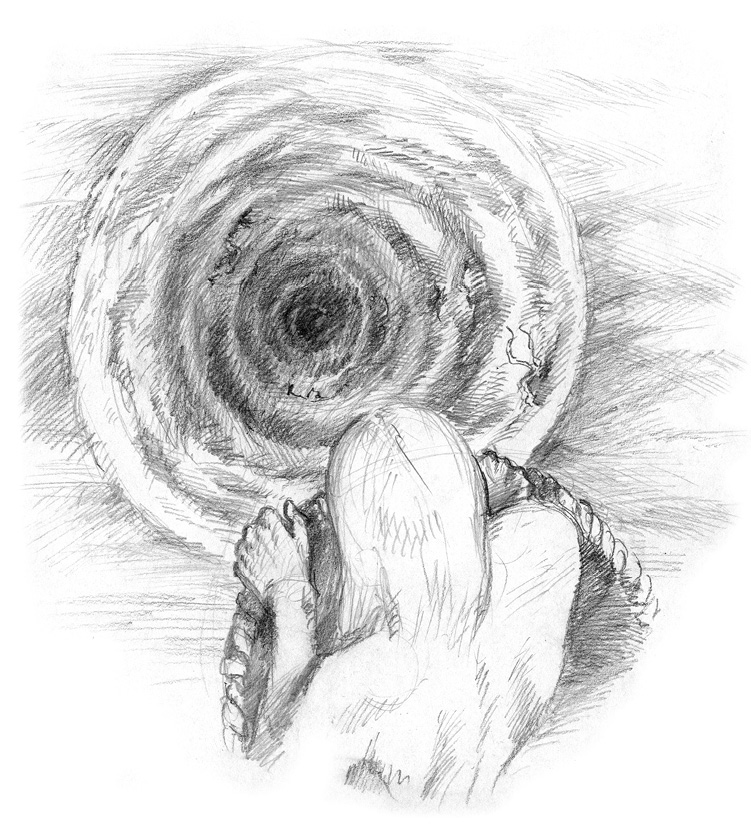 Akron trat vor mich hin, umarmte mich und wünschte mir viel Glück. Dann sprang ich in den Korb. Mein Seelenführer trat an die alte Kurbel des Aufzugs und mit einem Ruck setzte sich mein brüchiges Gefährt knarrend und quietschend in Bewegung. Ein letztes Mal begegneten sich unsere Blicke, dann war seine Gestalt schon hinter dem Rand der schmalen Öffnung verschwunden, in deren dunkler Untiefe ich mit jeder weiteren Umdrehung der Winde verschwand. In mir überschlugen sich die Gedanken, und obwohl ich mich nicht mehr in der Hölle, sondern im Fegefeuer wusste, verspürte ich dennoch eine unangenehme Steigerung des Ganzen. Der Ablauf meiner Höllenfahrt war an keinen zeitlichen Ablauf gebunden, vielmehr hatte ich das Gefühl, gleichzeitig oben, unten und in der Bewegung des Fallens zu sein. Wie durch einen Schleier sah ich die feuchten Wände des engen Schachtes und die lehmige Erde am Boden der Gruft. Ich fühlte mich von zwei verschiedenen Welten umzingelt, wobei die eine sich mir näherte, wenn sich die andere von mir entfernte. Einem durch Erdrosseln zum Tod Verurteilten ähnlich zog sich die Fessel der Angst mit jedem weiteren Ruck in die Tiefe fester um meinen Hals zusammen und ließ mich erahnen, dass mich dort unten nur etwas erwarten konnte, zu dem seit Äonen weder ein Lichtstrahl noch ein klein wenig Liebe hinab gedrungen sein konnten. Irgendwie war es eine unterschwellige Sehnsucht nach dem Unbekannten. Das dumpfe Aufschlagen des Korbes beendete meine Fahrt zum Mittelpunkt meiner Seele. Dann wurde es Nacht.