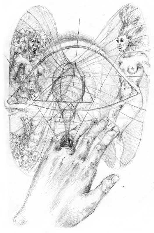 „Hier, nimm den – den wirst du da unten brauchen!“ Zu meiner großen Überraschung reichte er mir seinen persönlichen Ring, den ich immer an ihm bewundert hatte. Als ich gebannt hinsah, hatte ich das merkwürdige Gefühl, als ob sich eine dreidimensionale Projektion auf der polierten Oberfläche abzeichnete mit einem irisierenden Leuchten an den Kanten der Ränder, in denen ich plötzlich so etwas wie einen in ein Dreieck eingedrehten Kreis zu erkennen glaubte. Mein erstaunter Blick wurde von ihm mit einem väterlichen Lächeln erwidert. Dann teilte er mir mit, dass mich dieser Ring fortan begleiten werde. Er schütze seinen Träger auf der Reise durch die infernalischen Abgründe und stamme aus dem Besitz meiner Vorfahren.“