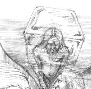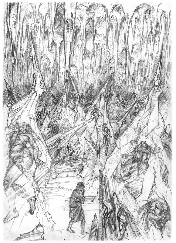 Ich erblickte ein gutes Dutzend erratischer Blöcke, die aussahen, als ob gefallene Meister aus dem oberen Teil der Säulen paralysierte nackte Leiber mit verkrümmten oder zerschmetterten Gliedern herausmoduliert hätten. Dazwischen befanden sich mannshohe Eisklötze, in denen Menschen mit eingefrorenen Schmerzensschreien auf den Lippen in schrecklichen Posen gefangen waren. Das Ganze erinnerte an mittelalterliche Folterszenen, bei denen die geschundenen Körper aufs Rad geflochten waren, oder dann waren die Köpfe so unnatürlich nach hinten gebogen, als ob der Nacken gebrochen wäre. Auf irgendeine Weise erinnerten diese teuflischen Verzerrungen auch an die gestalterischen Formen in der expressiven Kunst zum Thema Folter – Reflexionen eines schrecklichen Zaubers, der sich in dieser Umgebung zu einer beeindruckenden Erhabenheit ausweitete.