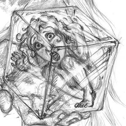 Am Ende des Ganges, von einer schwachen Lichtquelle erhellt, stand ein kristallener Kubus wie ein riesiger Eisblock, auf dem eine Gestalt in brauner Kutte thronte. Der verkrümmte Leib brachte in seinem schöpferischen Ausdruck den Abgrund des Entsetzens so meisterhaft zur Geltung, als ob er die Vorgaben von Bosch oder Munch übertreffen wollte. Der Vereinsamte schien völlig in sich versunken und machte keinerlei Anstalten uns zu begrüßen, geschweige denn, auch nur seinen Blick zu heben. „Er meditiert über den Schmerz seines unerlösten inneren Kindes“, machte sich der Verstand in meinem Kopf bemerkbar, „welches wie ein Embryo in ihm eingeschlossen ist“, und gemessenen Schrittes gingen wir auf ihn zu. Es schien mir, als wären seine Körperfunktionen ausgeschaltet und sein Geist völlig vereist, und hinter seiner Erstarrung spürte ich mein eigenes psychisches Muster, Ängste und Unkontrolliertheit hinter einer Form der Meditation zu tarnen.