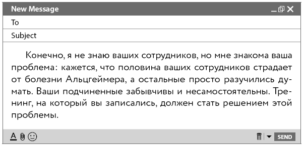 И тут супруга делает ход конем: «Дорогой, помнишь, как двенадцать лет назад ты терпеть не мог и, что скрывать, побаивался своего тогдашнего начальника? И помнишь, почему? Он совершенно бесчеловечно относился к подчиненным. Тогда ты поклялся себе, что будешь вести себя совершенно по-другому, когда станешь менеджером. И вот сегодня ты говоришь, что твои люди забывчивы и глупы. Поздравляю!»