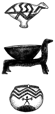 Oben: Keramikrassel in Vogelgestalt, gefunden in einem Grab bei Waldenbuch, Bayern, Deutschland, 7.–8. Jh. vor unserer Zeit.
